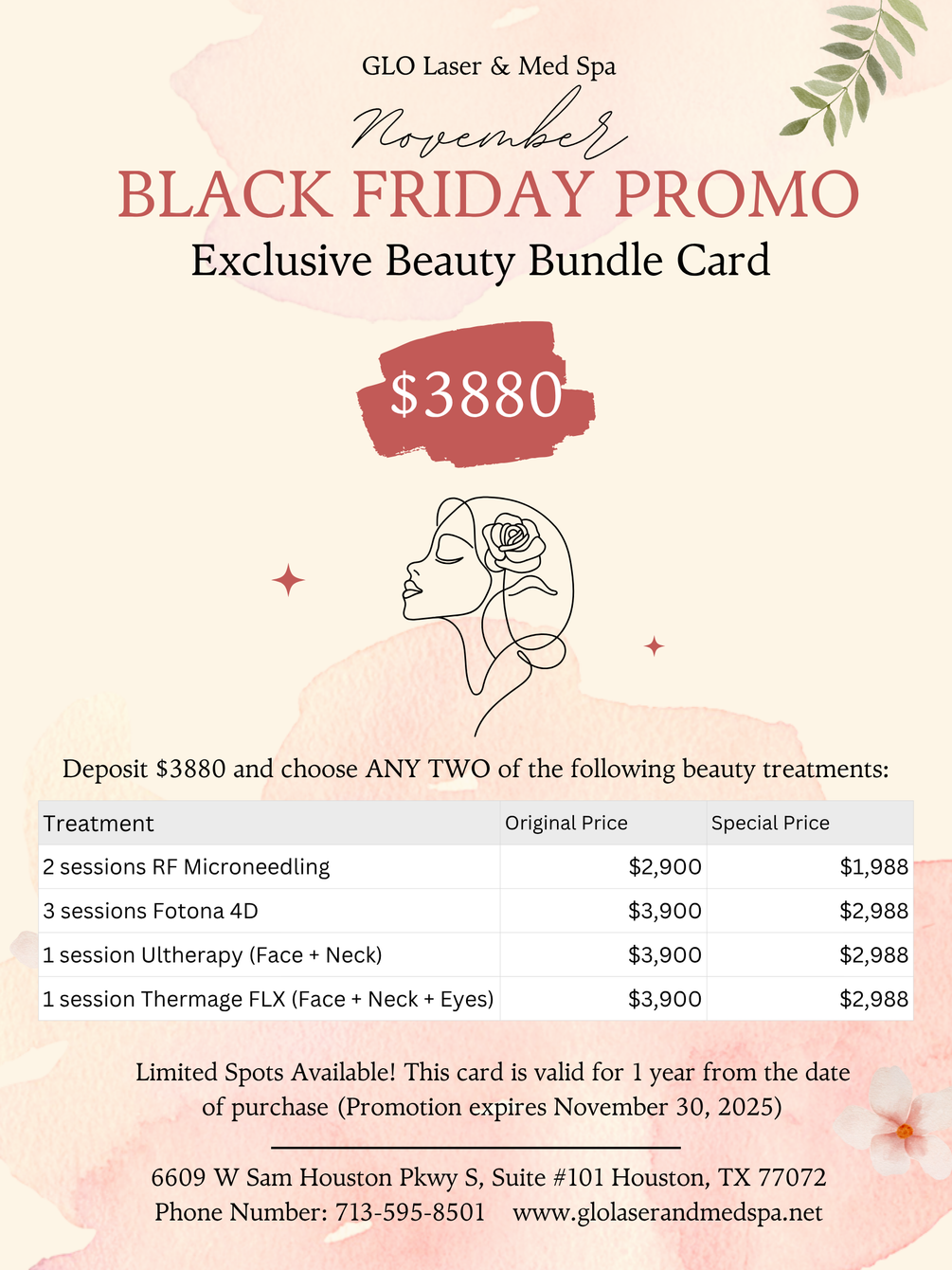 Ready to refresh your look just in time for the holidays? This Black Friday, indulge in luxurious med spa treatments at unbeatable prices! At Glo Laser & Med Spa in Houston, we combine cutting-edge technology and FDA-approved products for everything from laser skin treatments to age-defying solutions. Our expert team is here to help you achieve your dream look and leave you feeling rejuvenated.